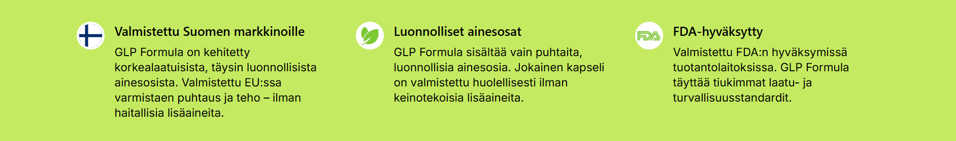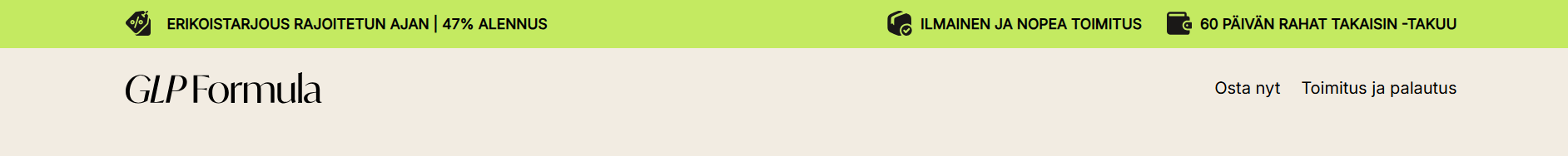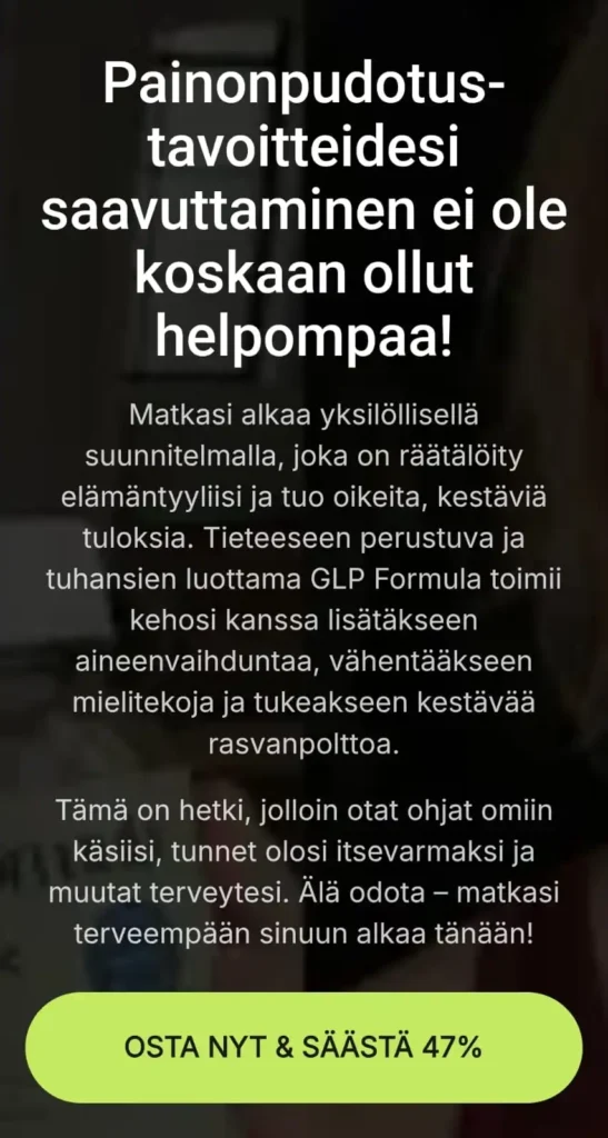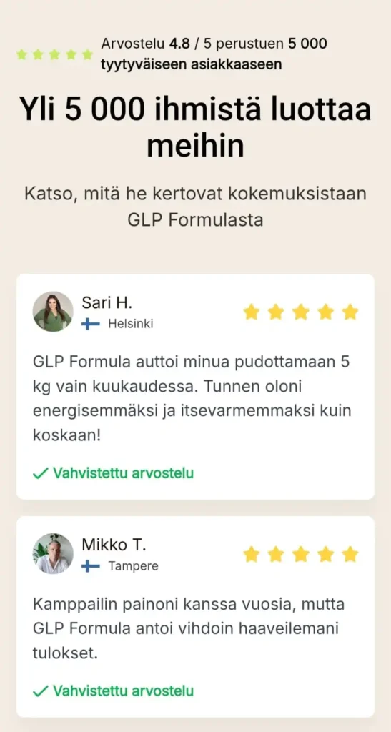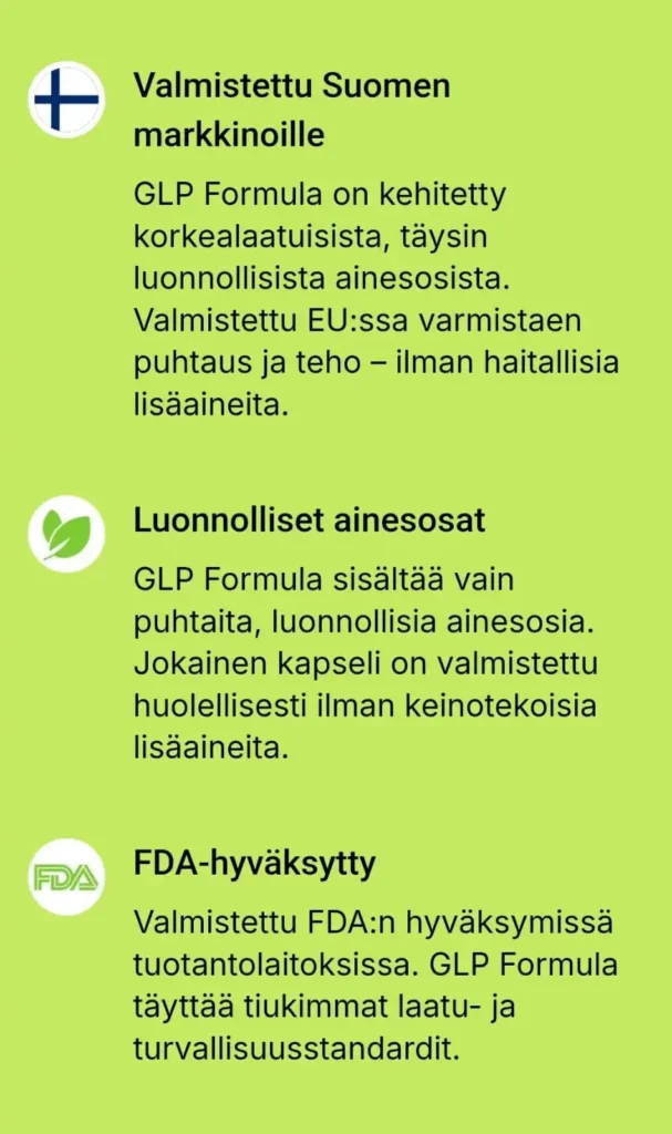 Glp Formula tarjoaa täyden 60 päivän tyytyväisyystakuun. Tämä tarkoittaa, että asiakas voi kokeilla tuotetta rauhassa ja palauttaa sen, mikäli se ei vastaa odotuksia. Tällainen takuu on harvinainen ja kertoo valmistajan luottamuksesta omaan tuotteeseensa. Ostaminen muuttuu näin täysin riskittömäksi, mikä tuo lisävarmuutta jokaiselle uudelle käyttäjälle.